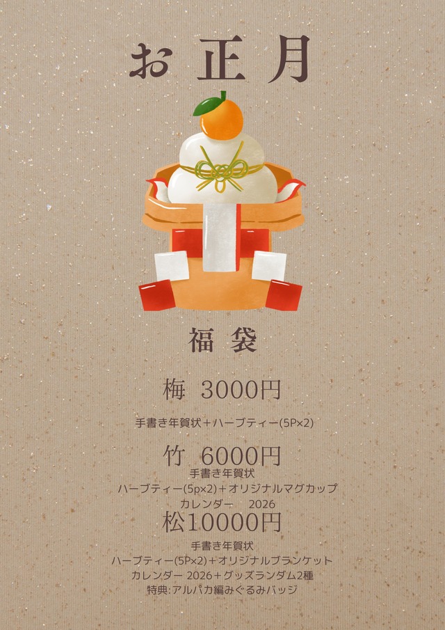 竹 ・手書き年賀状 ・紅茶10p ・2026オリジナルカレンダー ・特典アルパカ編みぐるみバッジ 2026年福袋販売 2025/12/16(火)~2026/1/4(日) 1月中旬以降順次発送致します。